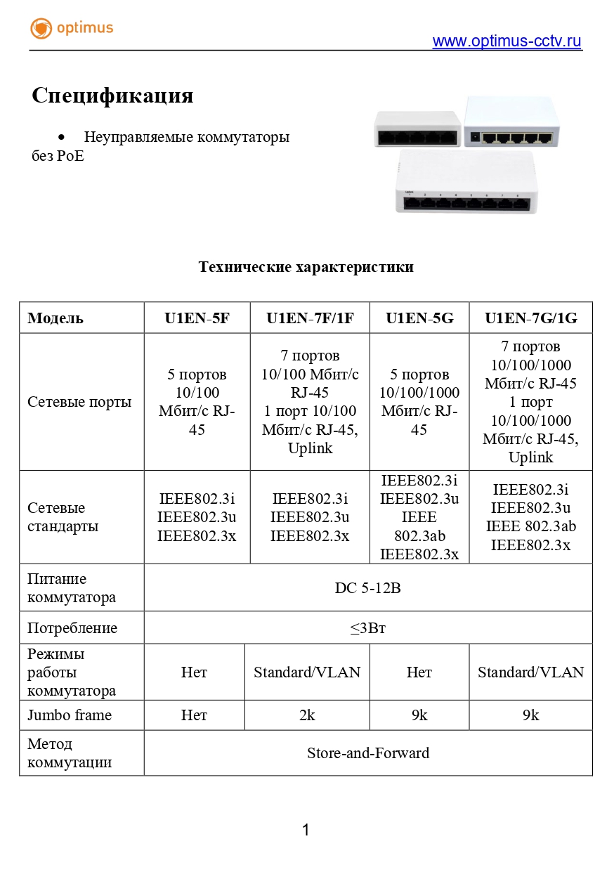 Optimus U1EN-7G/1G - это неуправляемый коммутатор без функции питания PoE. Он оснащен 7 портами10/100/1000 Мбит/с и 1 портом 10/100/1000 Мбит/с RJ-45, Uplink к каждому из которых можно подключать сетевые устройства (IP-камеры, IP-телефоны, беспроводные точки доступа). Блок питания имеет выходное напряжение 12 вольт.