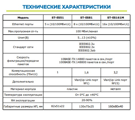 ST-ES51 сетевой 5-ти портовый коммутатор Space Technology; Ethernet порты: 5 х (10/100Мбит/с); 100 Мбит/канал; Uпит(В) 5...13В (±10%); IEEE802.3u,IEEE802.3x,IEEE802.3ab; 1Гбит/с; пластик; от 0°C до +40°C; 82х51х22 мм.