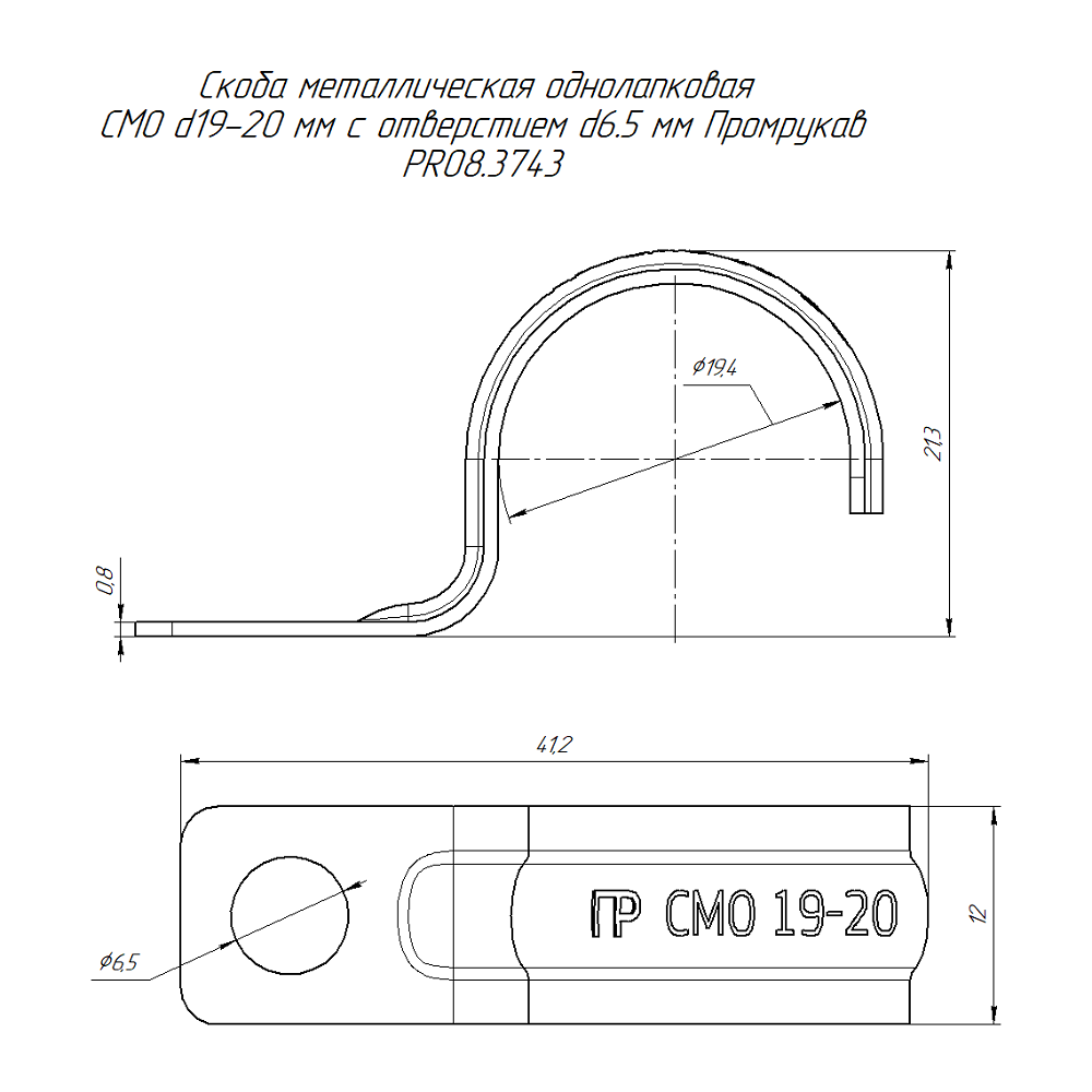 PR13.02425 скоба металлическая однолапковая усиленная противопожарная СМОУ d19-20 мм отв. d 6,5 мм (100шт/1200шт уп/кор) Промрукав; сталь; -60...300 °C; 0,00724 кг/шт.