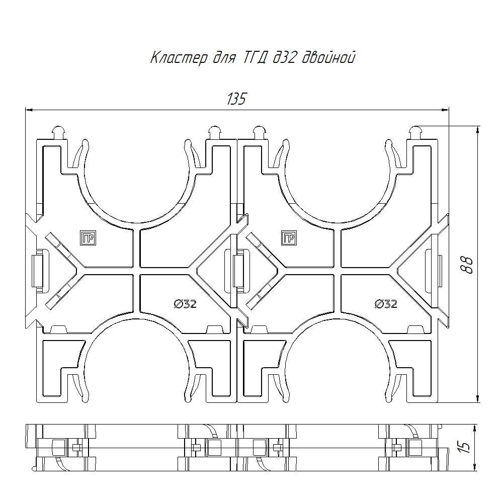 PR13.02565 кластер для двустенных труб d32 мм, двойной, двухсторонний (210 шт/кор) Промрукав; диаметр 32мм; RAL 9005; -55..90°C; 0,03775 кг.