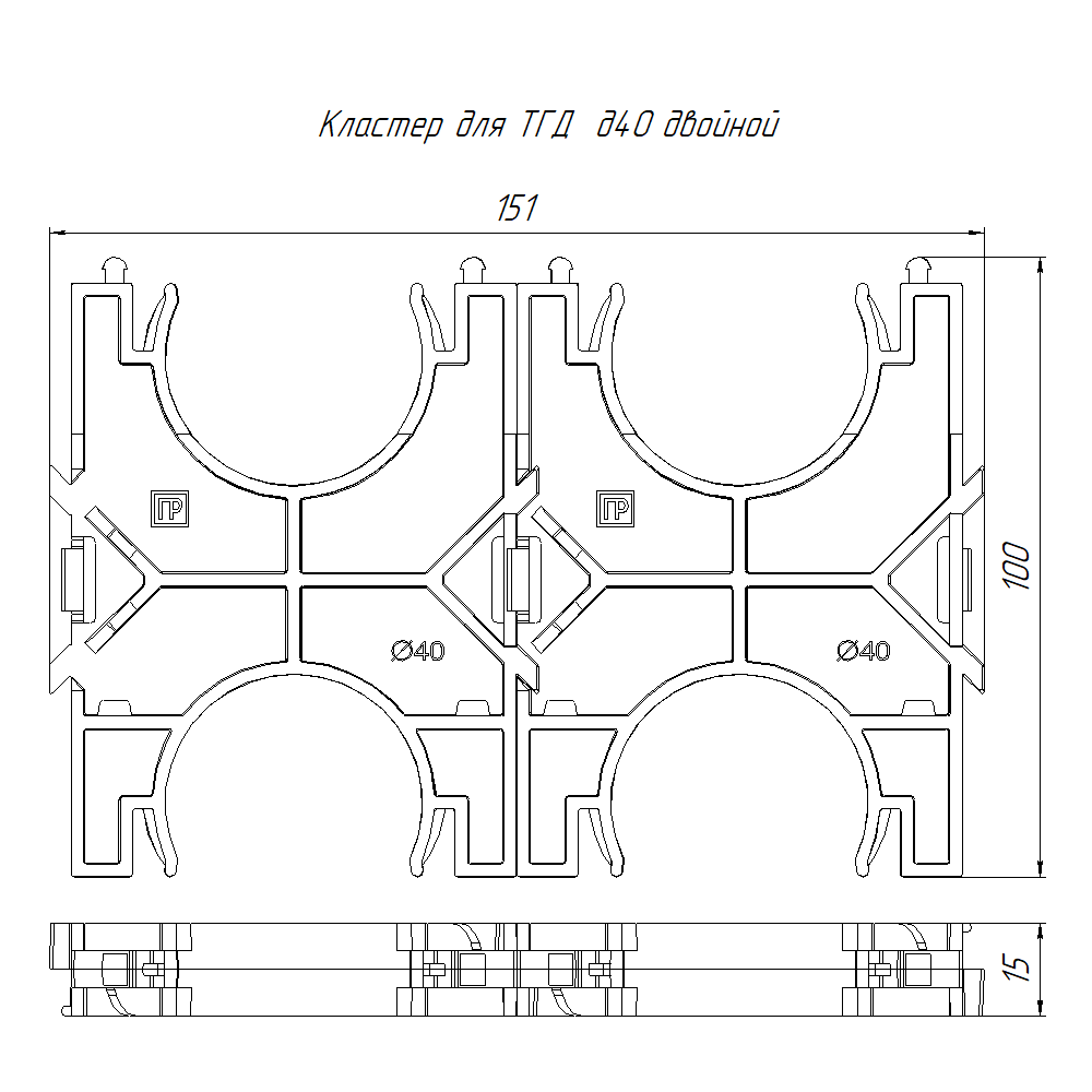 PR13.02566 кластер для двустенных труб d40 мм, двойной, двухсторонний (150 шт/кор) Промрукав; диаметр 40мм; RAL 9005; -55..90°C; 0,04521 кг.