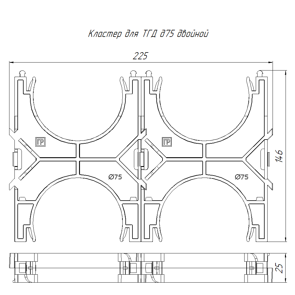 PR13.02569 кластер для двустенных труб d75 мм, двойной, двухсторонний (40 шт/кор) Промрукав; диаметр 75мм; RAL 9005; -55..90°C; 0,1301 кг.