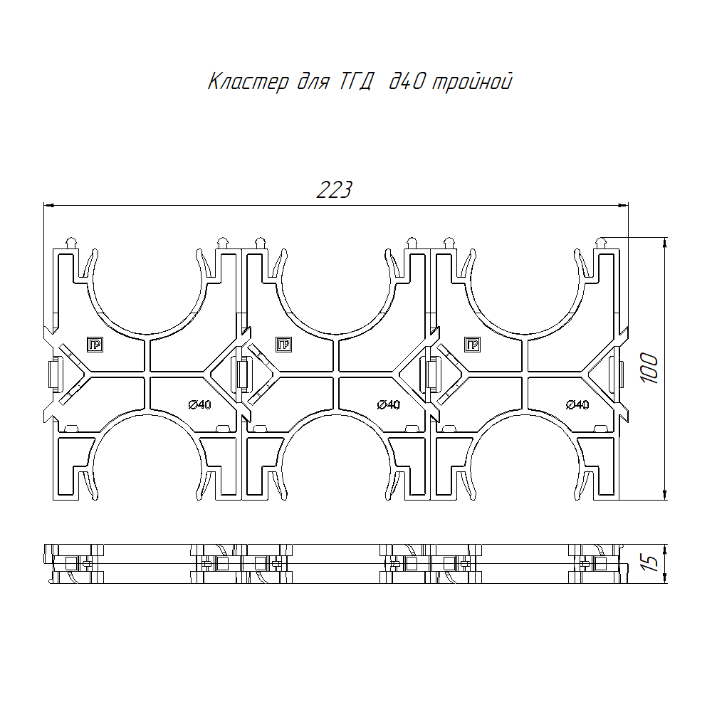PR13.02576 кластер для двустенных труб d40 мм, тройной, двухсторонний (90 шт/кор) Промрукав; диаметр 40мм; RAL 9005; -55..90°C; 0,06832 кг.