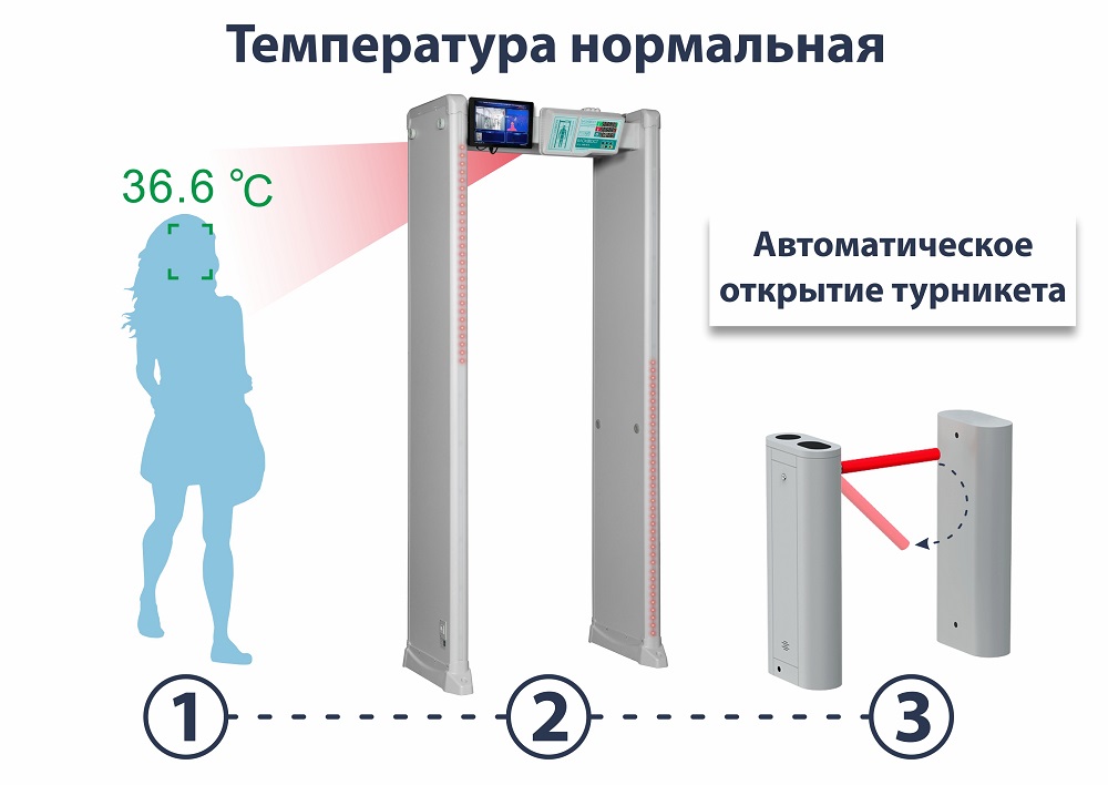 В корпус металлодетектора встроена бинокулярная тепловизионная камера. Она состоит из двух видеокамер инфракрасного и видимого диапазонов, а также модуля термодатчика немедицинского назначения. Прибор измеряет температуру живых объектов (в том числе при недостаточной освещенности), распознает и фиксирует лица посетителей с повышенной температурой тела.