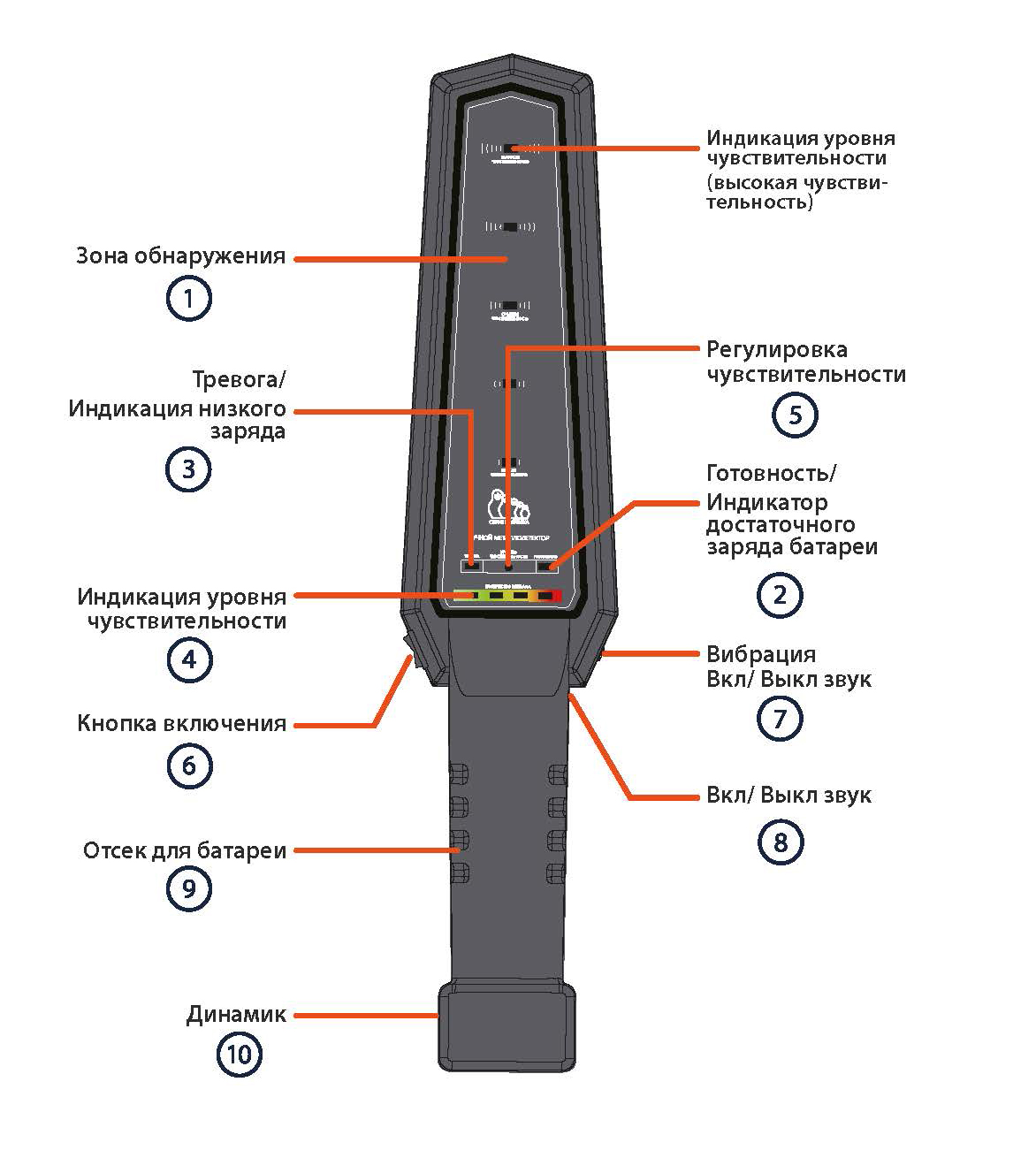 Ручной металлодетектор обнаруживает металлы весом от 1-2 грамм и опасные предметы с расстояния от 2 см.