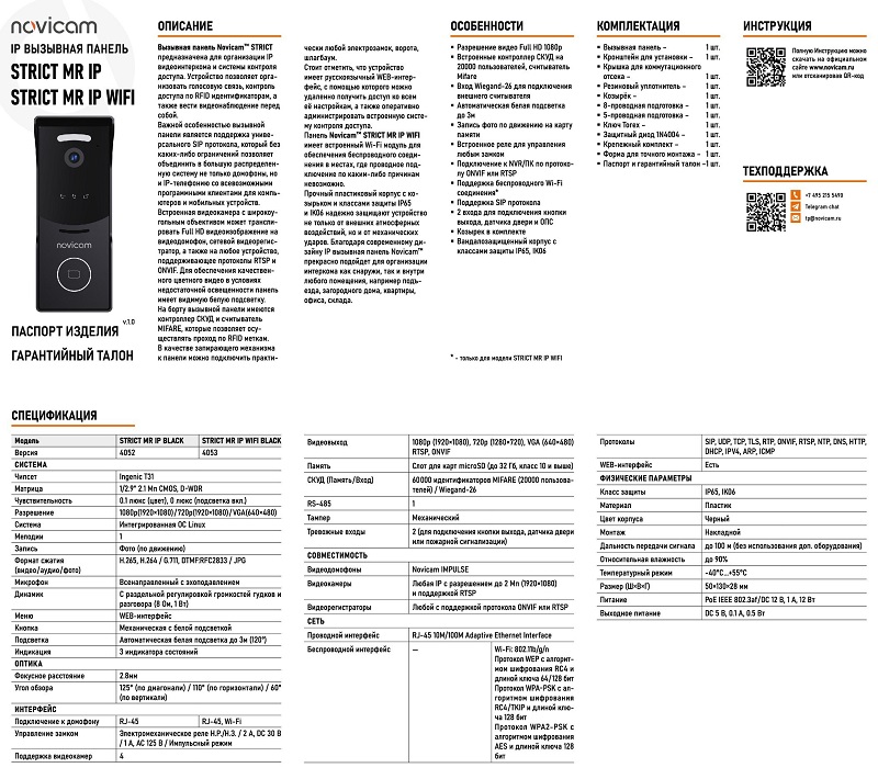 STRICT MR IP BLACK (ver.4052) IP-вызывная панель NOVIcam; Ingenic T31; 1080p; интегрированная OC Linux; механическая кнопка; фокусное расстояние 2.8мм; угол обзора по д/г: 125°/110°; белая подсветка до 3м (120°); microSD до 32 Гб; пластик; IP65, IK06; -40° ~ +55°С; 50x130x28 мм; 200 г.