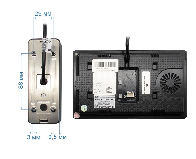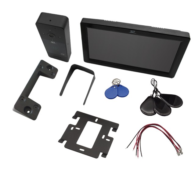 Комплектность: Монитор видеодомофона с кабелем питания 220В, крепежным комплектом и кронштейном для установки соединительный кабель (2 контакта) - 3 шт вызывная панель видеодомофона c кабелем для подключения к монитору и замку кронштейн для поворота панели на 30° монтажная пластина IC карта - 5 шт монтажный комплект для крепления на стену паспорт и упаковочная коробка