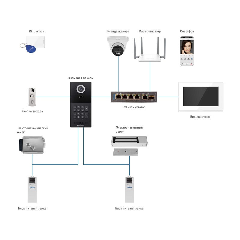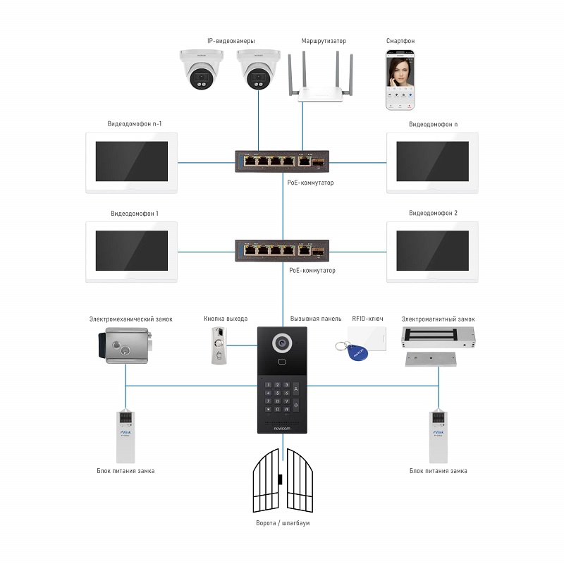 Поддержка 10 вызывных панелей, 8 видеокамер, 9 видеодомофонов, 8 датчиков