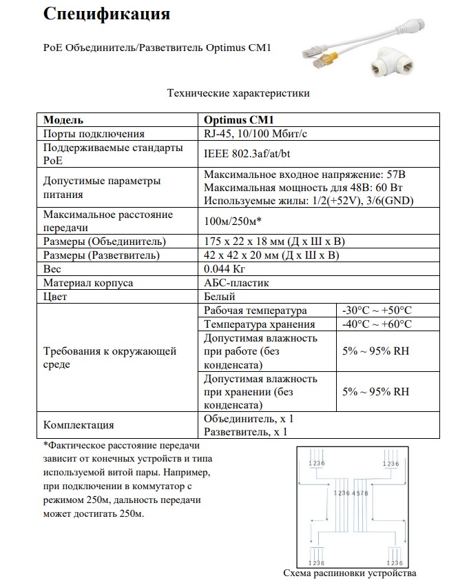 CM1 PoE объединитель/разветвитель Optimus; RJ-45; 10/100 Мбит/с; IEEE 802.3af/at/bt; АБС-пластик; 0.044 кг.