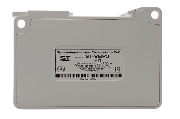 ST-VBP3 (версия 2) приемопередатчик удлинитель сигнала по UTP кабелю Space Technology; IEEE 802.3, IEEE 802.3u, IEEE802.3af/at; потребляемая мощность 1,2 Вт; IP54; От -45°С до 60°С; 85мм*58мм*23мм; 0,1 кг.