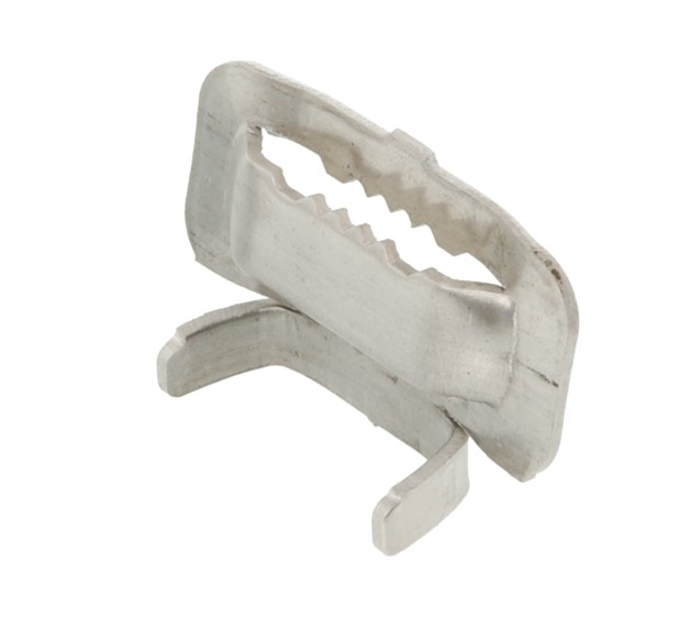 Скрепа изготовлена из стали марки 304. Толщина материала и размеры скрепы подобраны с таким расчетом, что узел крепления из ленты со скрепой обеспечивает прочное крепление арматуры ВОЛС на опоре, удерживающее ее при неблагоприятных факторах (ветер, гололед), в то же время разрушается при критических нагрузках(падение дерева, падение опорного столба), что обеспечивает целостность кабеля. Скрепа NMF-AL-EFCT-C предназначена для фиксации крепежной стальной ленты при монтаже арматуры ВОЛС на железобетонных, деревянных или металлических опорах воздушных линий электропередачи и связи. Материал изготовления - сталь толщиной 1.5 мм. Особенностью данной скрепы является наличие зубьев которые дополнительно удерживают ленту в пазу.