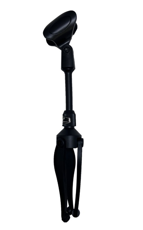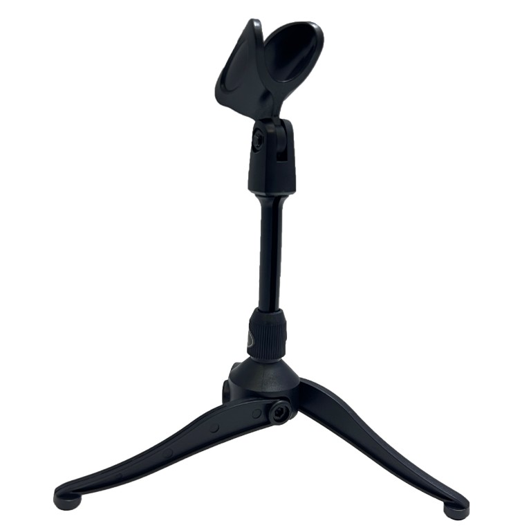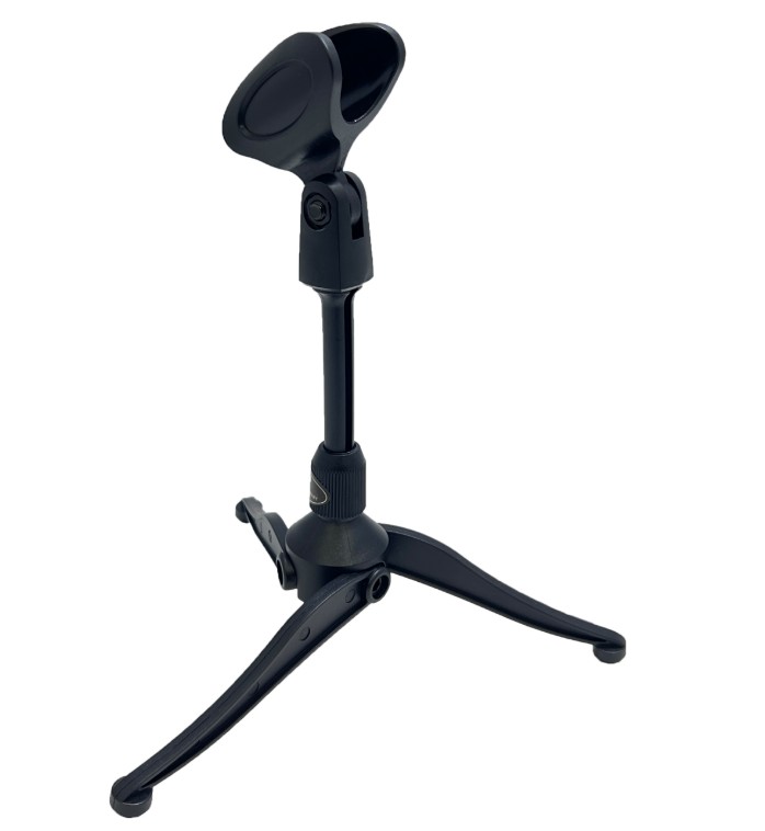 Стойка микрофонная настольная прямая телескопическая со складными ножками и держателем микрофона в комплекте.