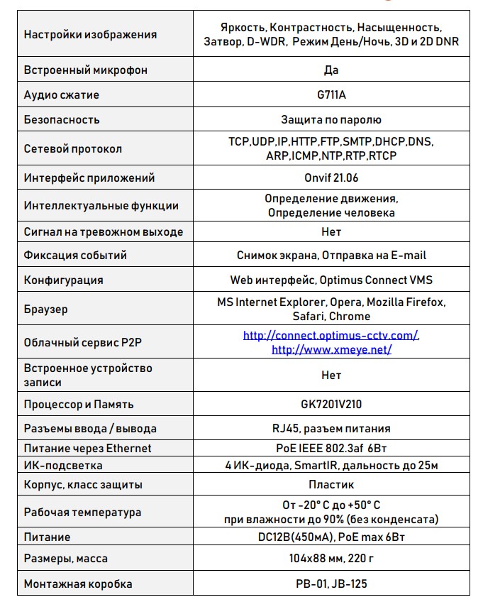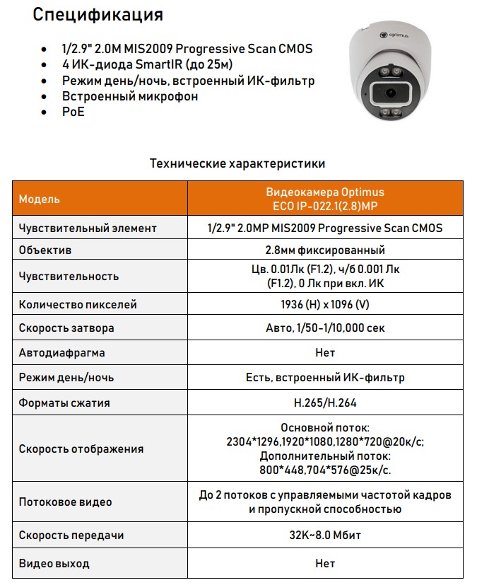 ECO IP-022.1(2.8)MP IP-камера видеонаблюдения Optimus; 1/2.9" 2.0MP MIS2009 Progressive Scan CMOS; PoE IEEE 802.3af 6Вт; объектив фиксированный 2.8 мм; встроенный ИК-фильтр; ИК-подсветка 4 ИК-диода до 25 м; встроенный микрофон; H.265/H.264; DWDR; Onvif; PoE; -20...+50°С; 104х88 мм; 220 г.