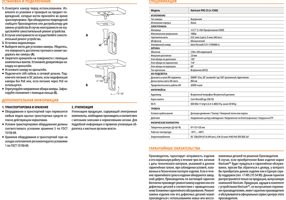 PRO 25 (ver.1500) внутренняя компактная IP-камера c Wi-Fi Novicam; 1/2.7" 2.1 Mpix Прогрессивная CMOS; 1080p (1920x1080p) 25/30 к/с; объектив 2.8 мм; 2 Mpix c ИК коррекцией; угол обзора В/Г/Д:50°/114°/135°; ИК подсветка 10 м; 35° основной/до 120° рассеянный; механический ИК фильтр; Wi-Fi; H.265+; слот Micro SD до 256 Гб; встроенный микрофон; встроенный динамик; WDR; PoE; 3D DNR; ONVIF; Р2Р; ROI; VCA; -10°С...+60°С; 92х72х135 мм.; 365 г.