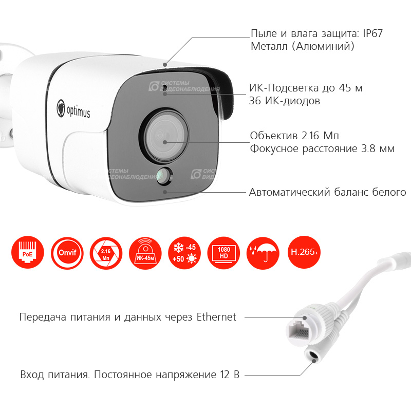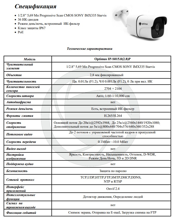 IP-S015.0(2.8)P уличная IP-камера видеонаблюдения Optimus; 1/2.8” 5,69 Мп Progressive Scan CMOS SONY IMX335 Starvis; 2704x2104; объектив 2,8 мм фиксированный; ИК-подсветка 30 м, 36 ИК диодов; H.265/H.264; DWDR; облачный сервис P2P; PoE; -45...+50°С; корпус металл (алюминий), антивандальный; IР67; 193х62 мм; 350 г.