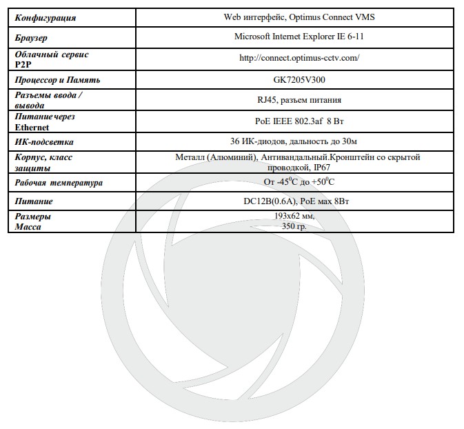 Камера выполнена в металлическом антивандальном корпусе степенью защиты IP67. Рабочая температура от -45° С до +50° С.
