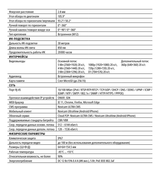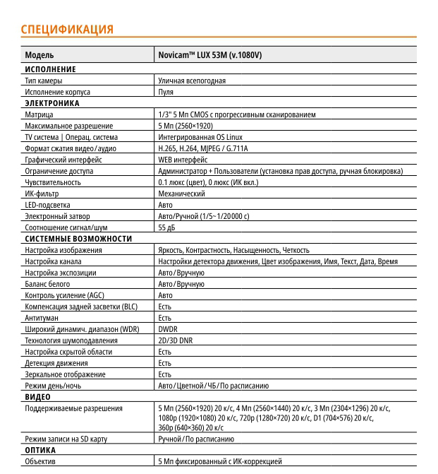 LUX 53M (ver.1080V) уличная всепогодная IP-видеокамера Novicam; 1/3" 5 Мп CMOS с прогрессивным сканированием; объектив 2.8 мм 5 Мп c ИК коррекцией; зум оптический/цифровой: -/Есть; угол обзора по В/Г/Д:50.2°/93.2°/105.9°; встроенный микрофон; поддержка Micro SD до 256 Гб; ONVIF; H.265, H.264, MJPEG; DWDR; PoE; P2P; IP67; -45°С...+55°С; 64×64×154.5 мм; 507 г.