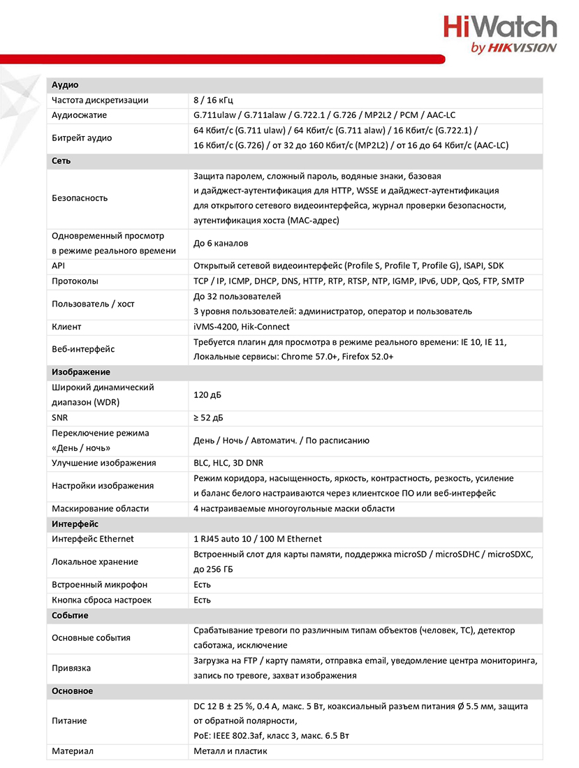 Безопасность: Защита паролем, сложный пароль, водяные знаки, базовая и дайджест-аутентификация для HTTP, WSSE и дайджест-аутентификация для открытого сетевого видеоинтерфейса, журнал проверки безопасности, аутентификация хоста (MAC-адрес)