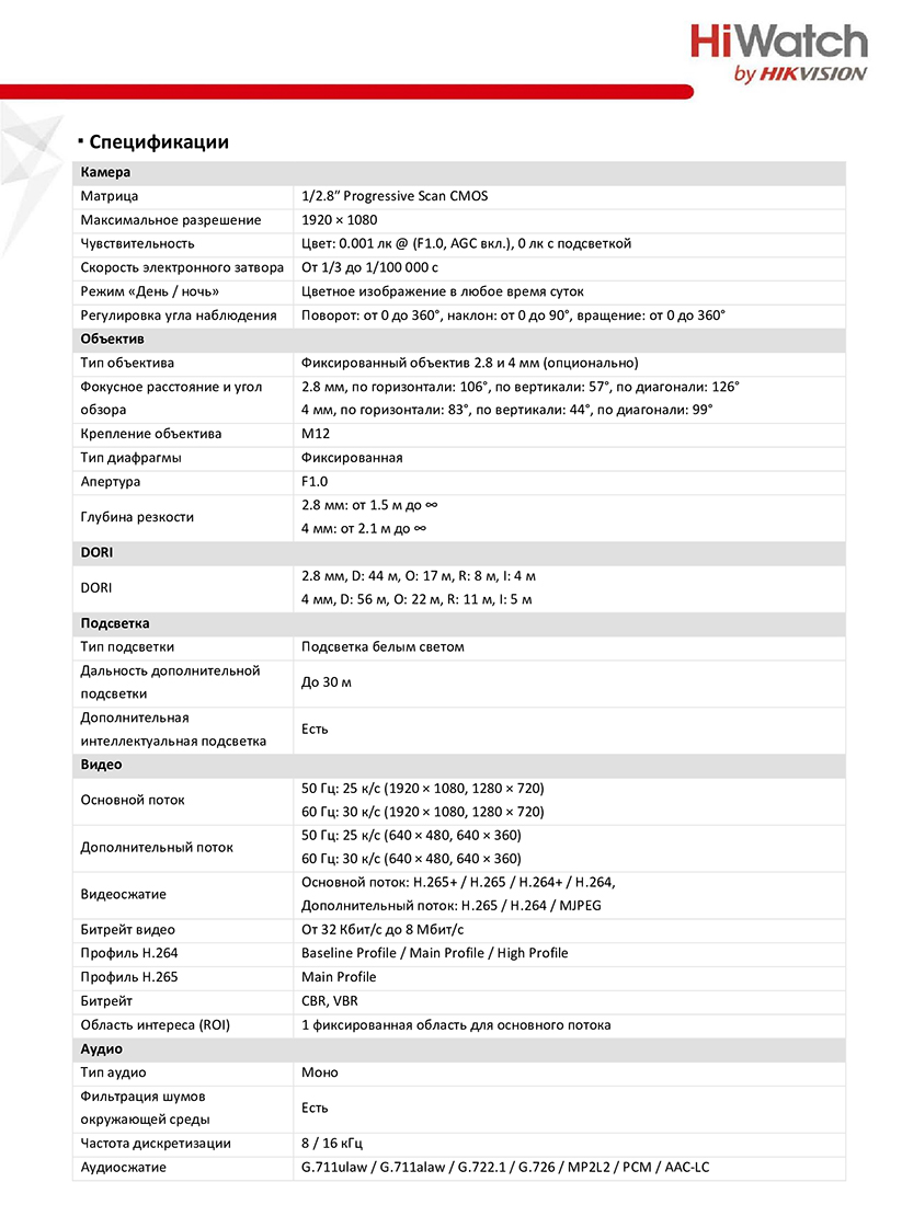 Чувствительность: Цвет: 0.001 лк @ (F1.0, AGC вкл), ч/б: 0 лк с подсветкой белым светом