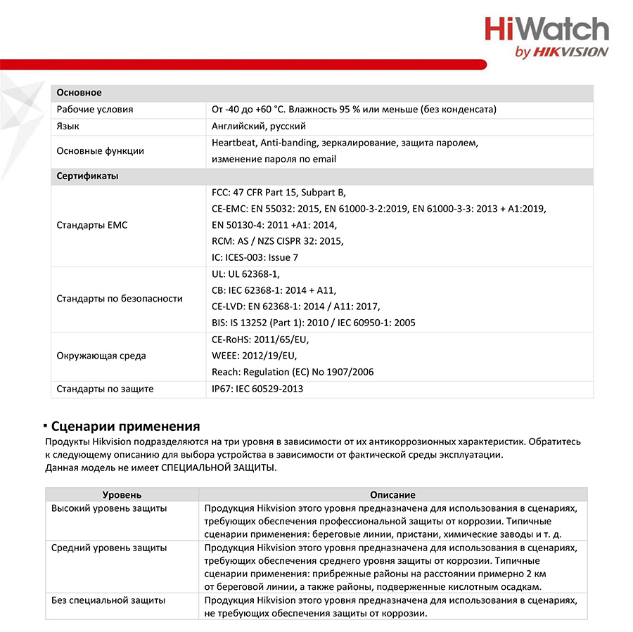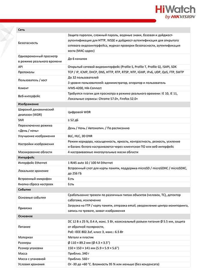 Безопасность: Защита паролем, сложный пароль, водяные знаки, базовая и дайджест-аутентификация для HTTP, WSSE и дайджест-аутентификация для открытого сетевого видеоинтерфейса, журнал проверки безопасности, аутентификация хоста (MAC-адрес)