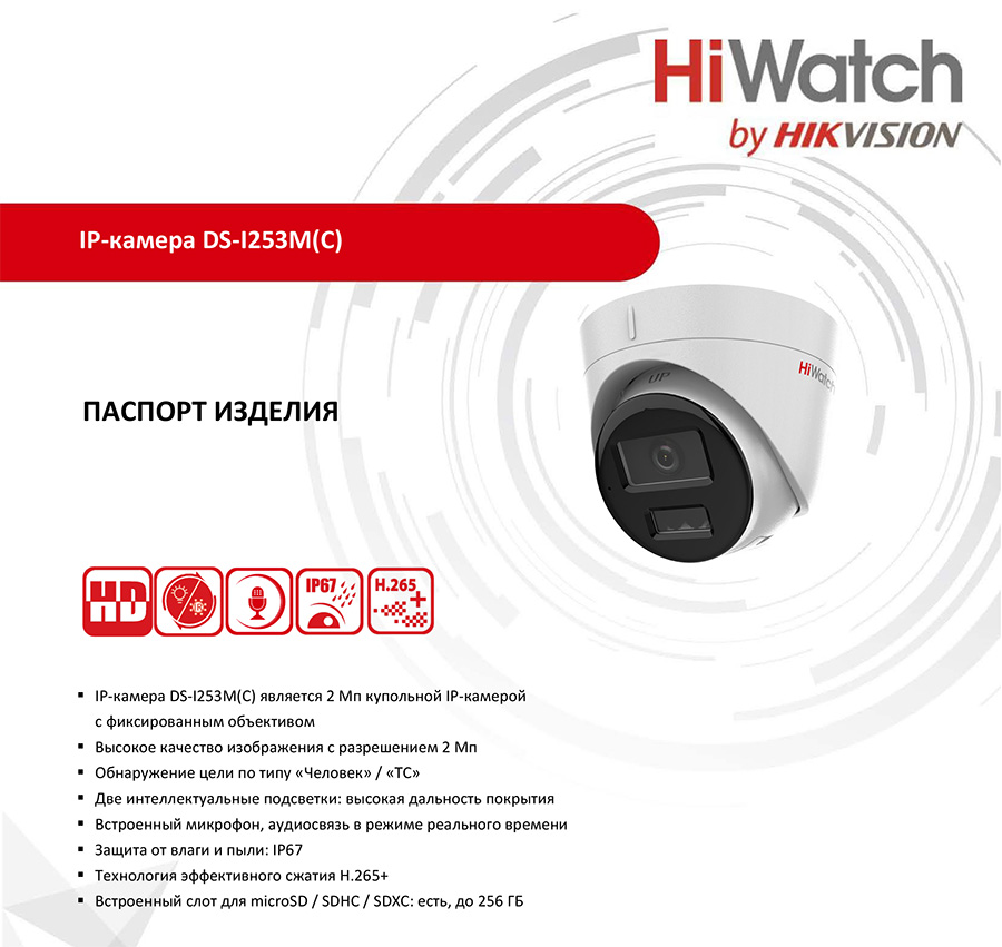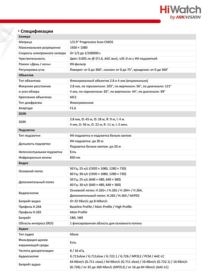 DS-I253M(C) (2.8 mm) уличная IP-камера с встроенным микрофоном HiWatch; 2 Мп 1/2.9" Progressive Scan CMOS; фиксированный объектив 2.8 мм; ИК-подсветка до 30 м; угол обзора по Г/В/Д:103°/56°/121°; H.265+/H.264/MJPEG; WDR; PoE; IP67; -40...+60°C; 110х89.2 мм; 340 г.