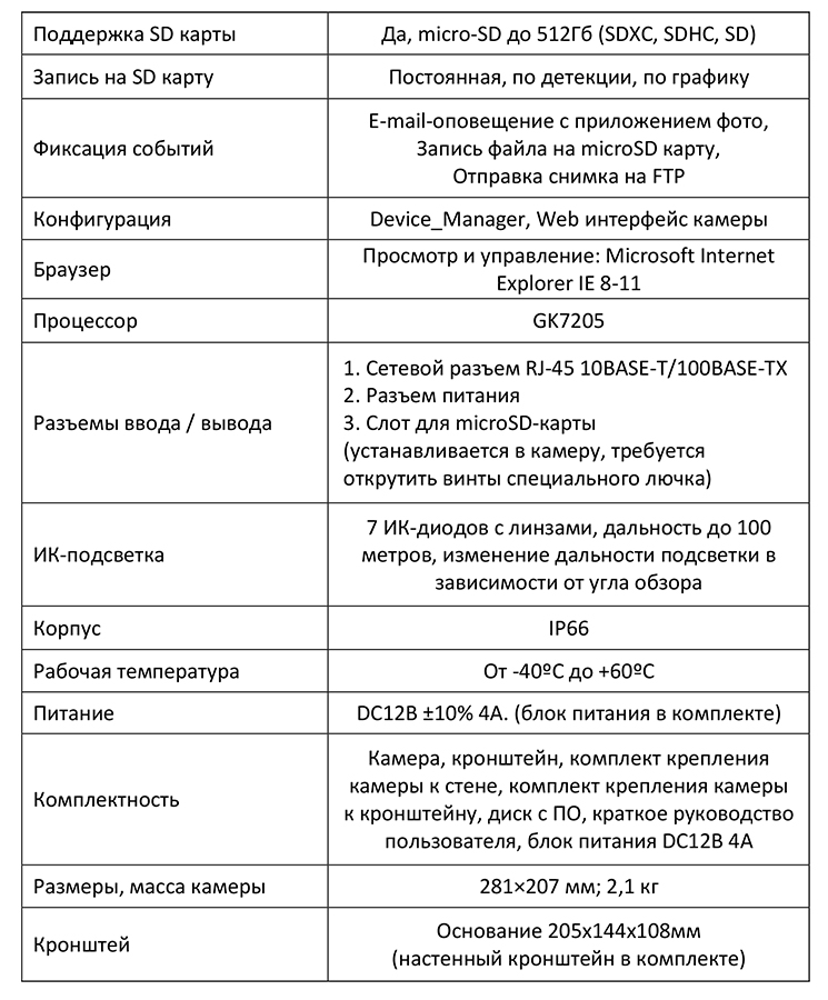 Комплектность: Камера, кронштейн, комплект крепления камеры к стене, комплект крепления камеры к кронштейну, диск с ПО, краткое руководство пользователя, блок питания DC12В 4А