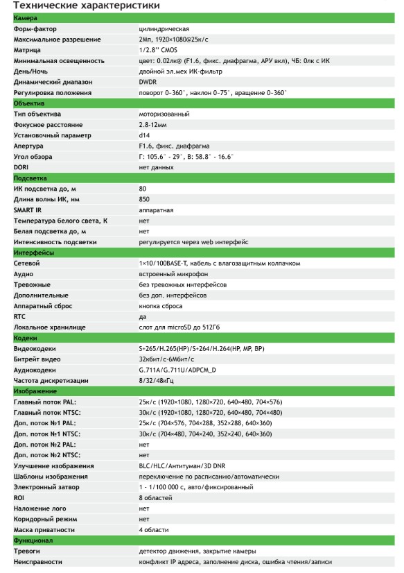 TC-C32UN Spec:I8/A/E/Y/M/2.8-12mm/V4.0 уличная IP-камера видеонаблюдения Tiandy; 1/2.8" CMOS 2Мп 1920x1080@30fps; объектив мотоизированный 2,8-12 мм; механичесий ИК фильтр; ИК-подсветка до 80 м, ИК диодов 4; встроенный микрофон; слот для карт памяти SD/TF Card до 512 Гб; S+265/H.265/H.264; DWDR; ONVIF; PoE; IP67; -35...+65°С.