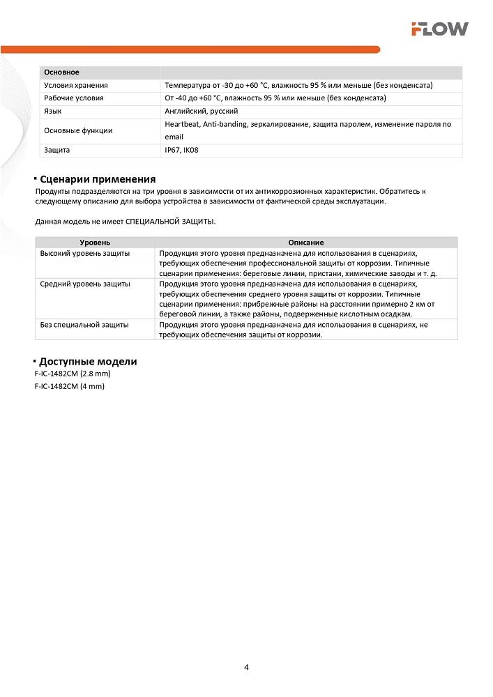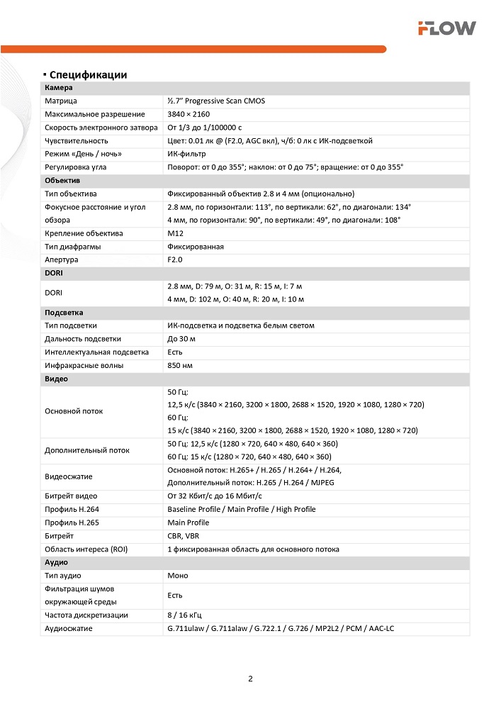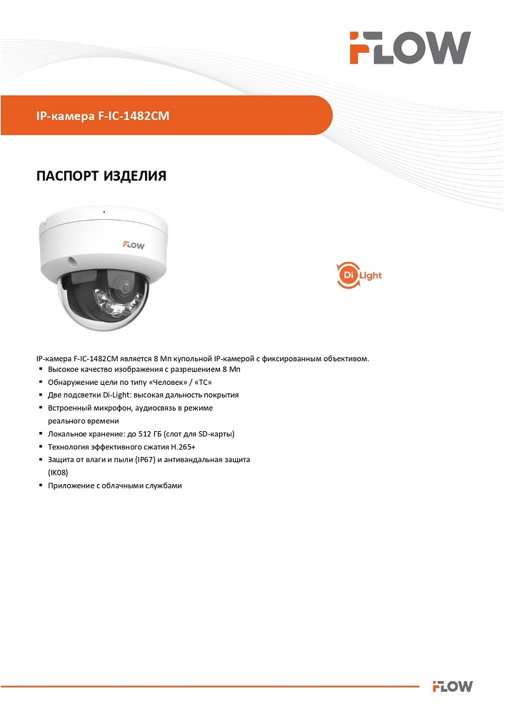 F-IC-1482CM(2.8mm) 8Мп уличная купольная IP-камера с гибридной Smart-подсветкой и встроенным микрофоном iFlow; 1/2.7'' Progressive Scan CMOS матрица; объектив 2.8мм; угол обзора 113°; механический ИК-фильтр; 0.01Лк@F2.0; 3840 × 2160@12,5к/с; H.265/H.265+/H.264/H.264+/MJPEG, HLC; WDR 120дБ; 3D DNR; BLC; ИК-подсветка 30 м; встроенный микрофон; microSD 512Гб; TVS; PoE; IP67; -40°C.