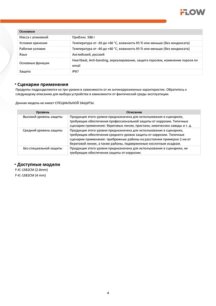 F-IC-1382CM(2.8mm) 8Мп уличная IP-камера с гибридной Smart-подсветкой и встроенным микрофоном iFlow; 1/2.7'' Progressive Scan CMOS матрица; объектив 2.8мм; угол обзора 113°; механический ИК-фильтр; 0.01Лк@F2.0; 3840 × 2160@12,5к/с; H.265/H.265+/H.264/H.264+/MJPEG; HLC; WDR 120дБ; 3D DNR; BLC; ИК-подсветка 30 м; встроенный микрофон; PoE; microSD 512Гб; TVS; IP67; -40°C до +60°C.