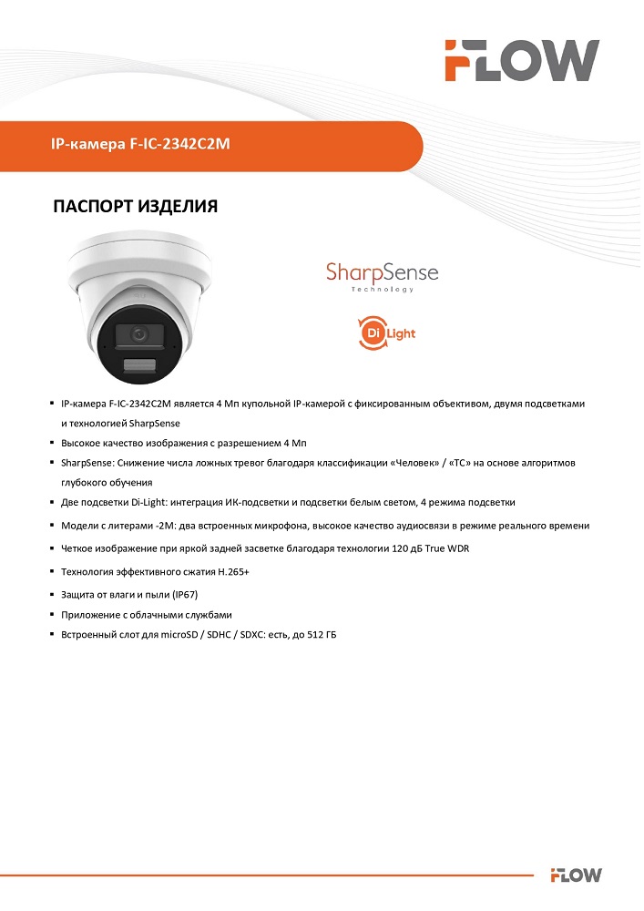 IP-камера F-IC-2342C2M является 4 Мп купольной IP-камерой с фиксированным объективом, двумя подсветками и технологией SharpSense