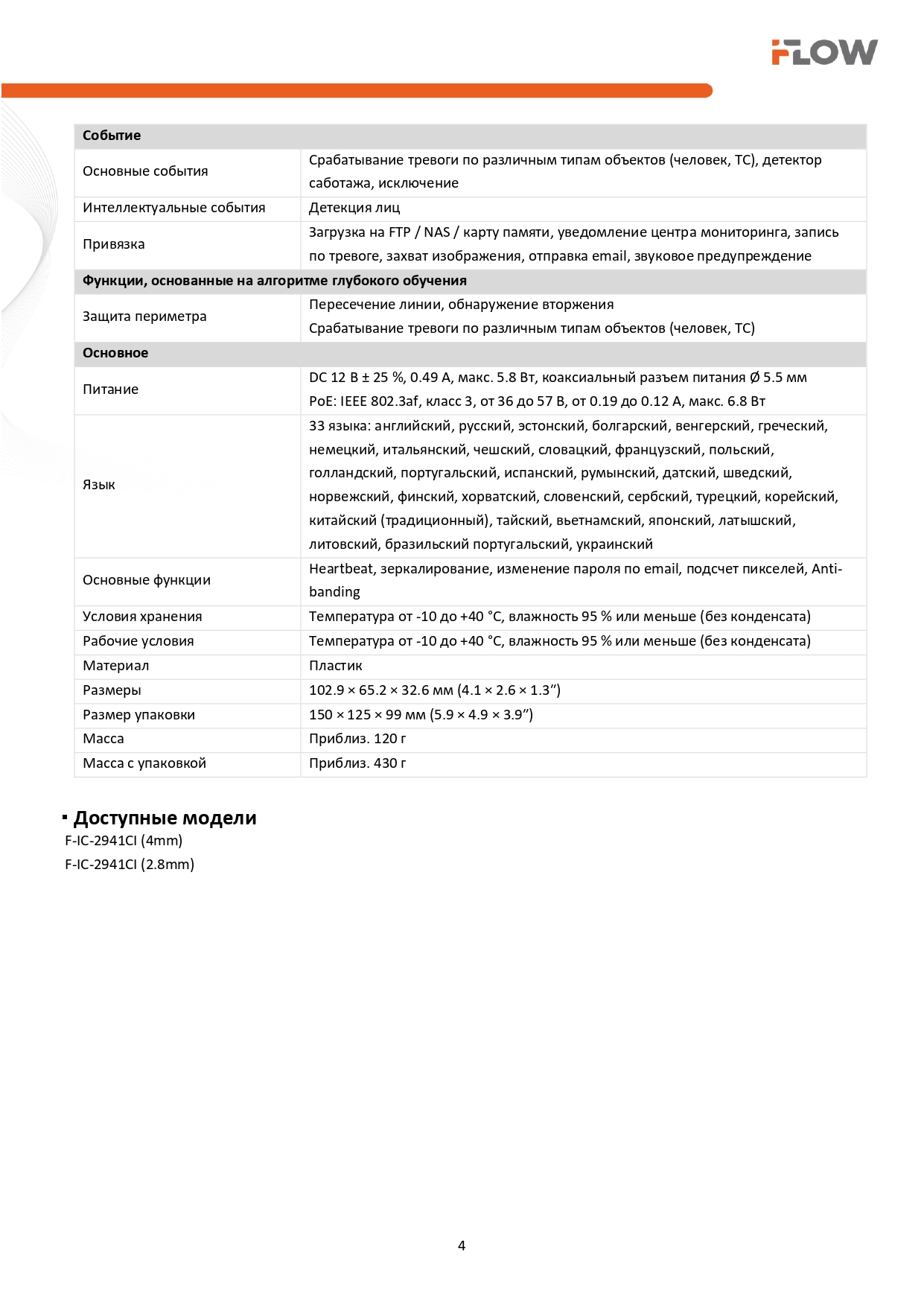 F-IC-2941CI(4mm) 4Мп внутренняя компактная IP-камера c ИК-подсветкой до 10м и технологией SharpSense iFlow; 1/3'' CMOS матрица; объектив 4мм; 2688 × 1520@25к/с; тройной поток; угол обзора 83,7°; механический ИК-фильтр; 0.005 лк @F1.6; H.265+/H.265/H.264+/H.264/MJPEG, WDR 120дБ, 3D DNR, HLC, BLC; ROI, встроенный микрофон/ динамик; PIR-датчик; Smart ИК; microSD 512Гб; TVS, -10°C ...+40°C; PoE ; 0.12кг.