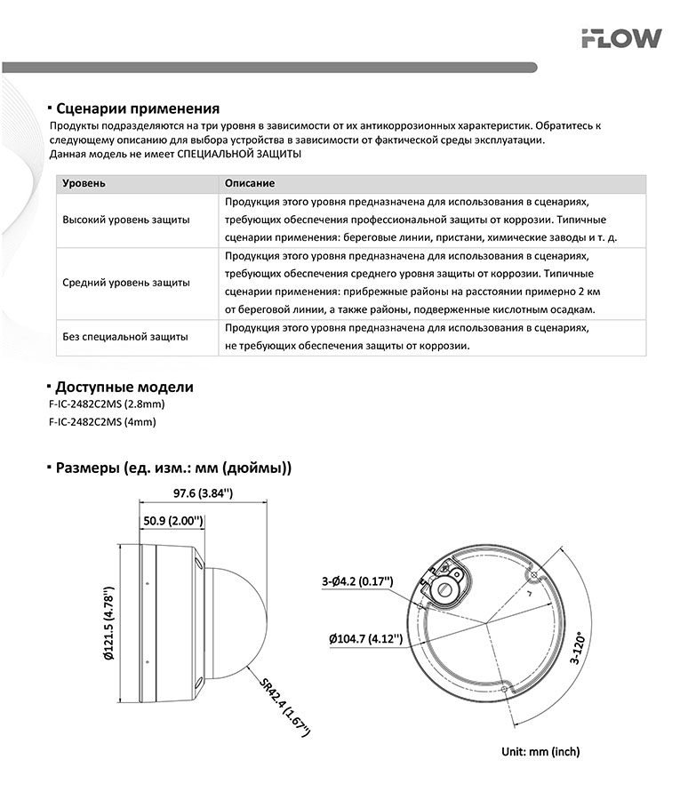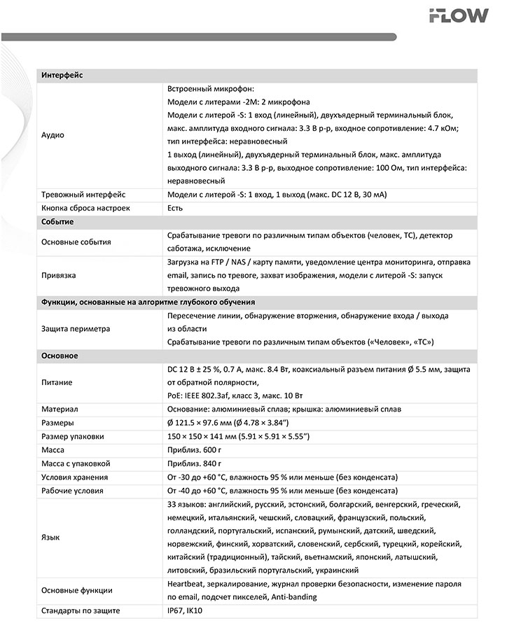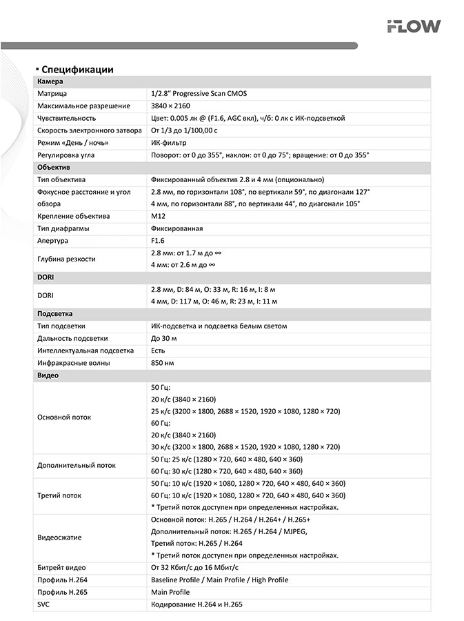 F-IC-2482C2MS(2.8mm) 8Мп уличная купольная IP-камера iFlow; 1/2.8" Progressive Scan CMOS; объектив 2.8 мм; угол обзора 108°; механический ИК-фильтр; SMART ИК-подсветка до 30 м; технология SharpSense; H.265/H.265+/H.264/H.264+/MJPEG; WDR; слот для microSD до 512Гб; 2 встроенных микрофона; DC12В± 25%/PoE; IP67; ONVIF; -40°C...+60°C; 0.6 кг.