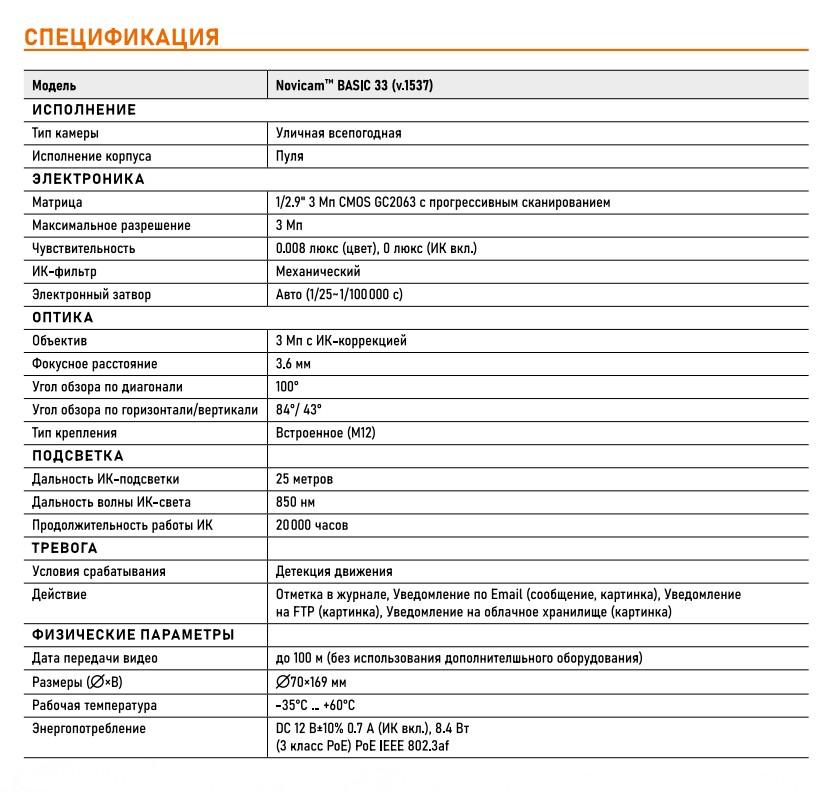 BASIC 33 (ver.1537) уличная всепогодная IP видеокамера Novicam; 1/2.9" Прогрессивная CMOS GC2063; объективы 3.6 мм; ИК подсветка SMART 25 м; угол обзора по в/г: 43°/84°; 1 х RCA; PoE; ONVIF и RTSP; поддержка облачного сервиса IPEYE; IP67; -35°С ~ +60°С; 70x169 мм (ДxД).