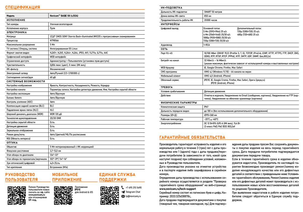 BASIC 58 (ver.1524) уличная всепогодная цилиндрическая IP видеокамера Novicam; 1/2.8" CMOS SONY Starvis Back-illuminated IMX335 с прогрессивным сканированием; 5 Мп 25 к/с; объектив моторизированный 2.7-13.5 мм; ИК подсветка SMART 50 м; угол обзора по в/г/д: 54°~16°/103°~29°/124°~33°; 1 × RCA; поддержка облачного сервиса IPEYE, ONVIF и RTSP; PoE; -35°С ~ +60°С; IP67; 95x268 мм; 300 г.