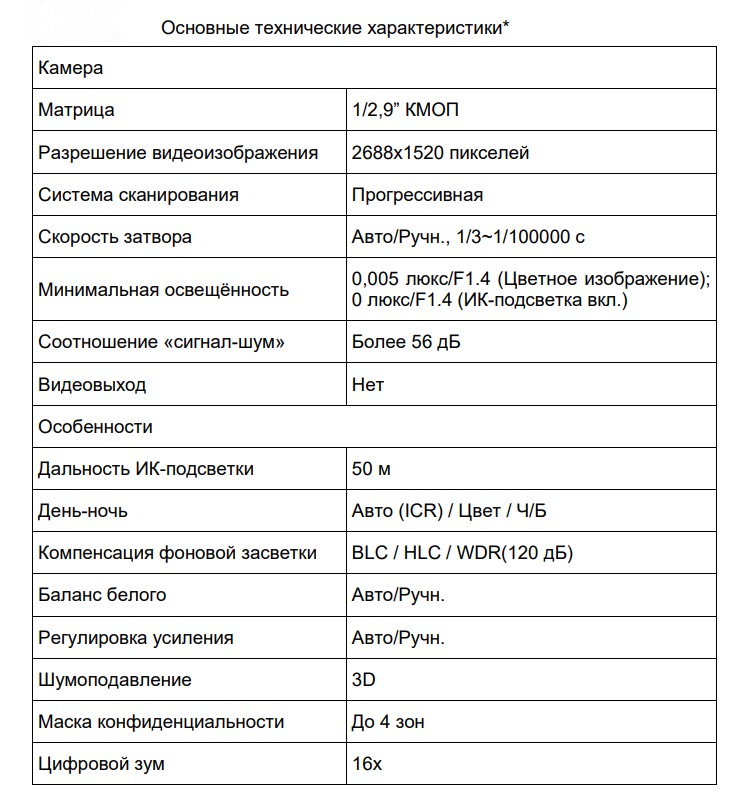Минимальная освещенность: 0,005 люкс/F1.4 (Цветное изображение); 0 люкс/F1.4 (ИК-подсветка вкл.)