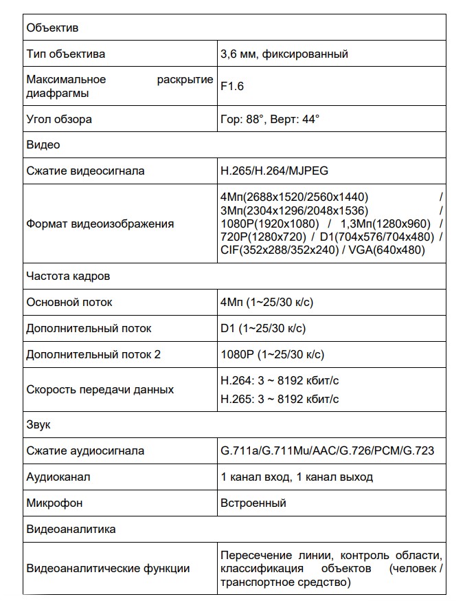 4 Мп, фиксированный объектив 3,6 мм, ИК-подсветка до 50 м, IP67.