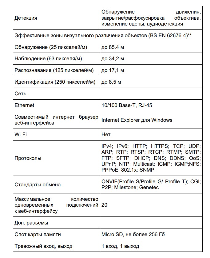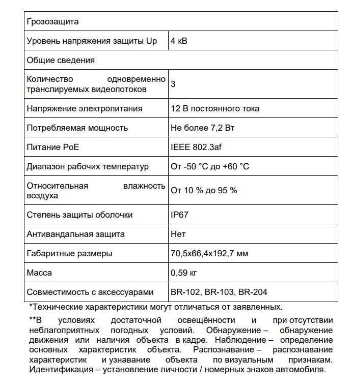 Нейросетевая классификация объектов: «Человек», «Транспортное средство». Оснащена «сухими» контактами и микрофоном. Позволяет распознать человека на расстоянии до 17 м, идентифицировать личность или автомобильный номер с расстояния до 8 м.