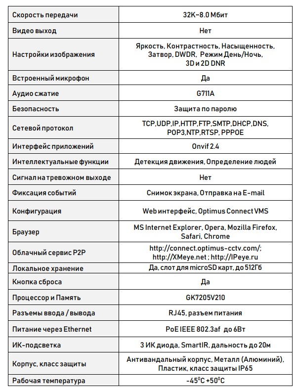 Камера выполнена в антивандальном корпусе степенью защиты IP65. Рабочая температура от -45° С до +50° С.