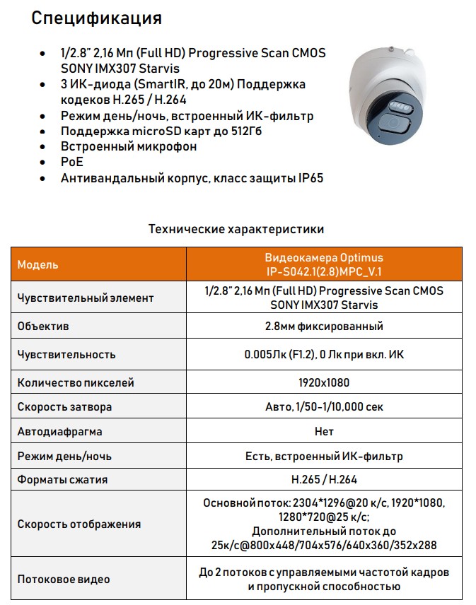 IP-S042.1(2.8)MPC_V.1 купольная IP-видеокамера Optimus; 1/2.8” 2,16 Мп (Full HD) Progressive Scan CMOS SONY IMX307 Starvis; объектив 2.8мм, фиксированный; 1920х1080; H.265/H.264; Onvif 2.4; RJ45; IР65; антивандальный корпус; -45°C +50°C; 90х98 мм; 300 г.