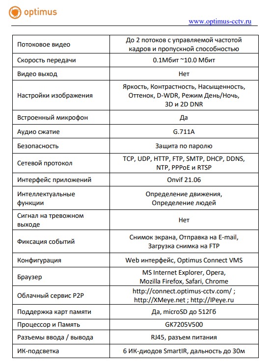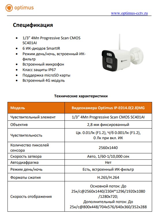 Уличная IP-видеокамера Optimus IP-E014.0(2.8)MG создана на основе 1/3” 4Мп Progressive Scan CMOS SC401AI.