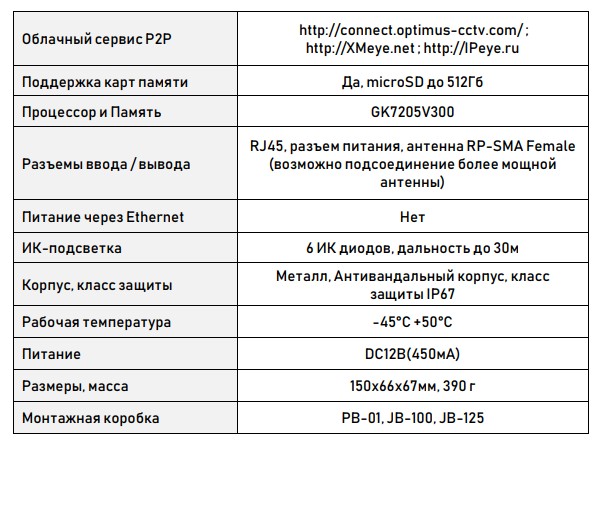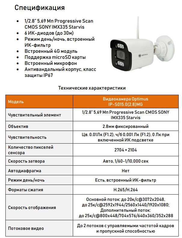 IP-S015.0(2.8)MG уличная IP-видеокамера Optimus; 1/2.8” 5,69 Мп Progressive Scan CMOS SONY IMX335 Starvis; поддержка microSD карты до 512Гб; RJ45; Onvif; встроенный микрофон; H.265/H.264; 4G модуль; 6ИК-диодов (до 30м); IР67, антивандальная; 2,8 мм фиксированный; 5 Мп; -45...+50°С; 150х66х67 мм; 390 г.