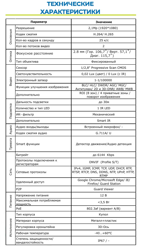Видеокамера ST-SA2651, цветная IP,Разрешение:2,1 Mp (1920*1080), с ИК подсветкой,детектор движения,аудио детекция,ROI (8 зон),4 приватные зоны,поворот изображения, Купольная, Фокусн. расст.: 2,8mm (Гор.106,7° /Верт. 57,1°/ Диаг. 115,7°), Сенсор: 1/2,8" Progressive Scan CMOS, Дальн. ИК подсветки: до 30 м, Светочувствит. (мин. освещ.): 0,02 Lux (цвет) / 0 Lux (с IR), Кодек сжатия: H.264/ H.265, Кодек сжатия аудио: G.711A/ U, Аудио вход/выход: Встроенный микрофон/ -, Напряжен. питания: 12 В, PoE: 802.3af (вариант А/В), ИК-фильтр: Механический, Функц. улучш. изобр.: BLC,HLC,DWDR,AGC,MGC,Антитуман,2D и 3D-DNR,AWB,MWB, Smart IR: есть, Guard Viewer, Кол-во к/с: 25 к/с, Регулир. кронштейна: 3D-Ось, Раб. темп.: -40…+60°С, Степень защищен./вандалостойкость: IP67 / -, Материал корпуса: Металл, пластик.
