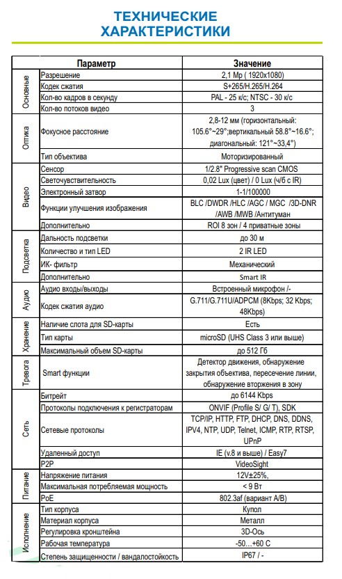 Видеокамера ST-VK2521 PRO , цветная IP,Разрешение:2,1 MP, с ИК подсветкой,детектор движения, обнаружение закрытия объектива, пересечение линии,обнаружение вторжения в зону,ROI 8 зон,4 приватные зоны, Купольная, Фокусн. расст.: 2,8-12mm (Гор. 105.6°~29° / Верт. 58.8°~16.6° / Диаг: 121°~33,4°), Сенсор: 1/2.8" Progressive scan CMOS, Дальн. ИК подсветки: до 30 м, Светочувствит. (мин. освещ.): 0,02 Lux (цвет) / 0 Lux (ч/б c IR), Кодек сжатия: S+265/H.265/H.264, Кодек сжатия аудио: G.711/G.711U/ADPCM (8Kbps 32 Kbps 48Kbps, Аудио вход/выход: Встроенный микрофон/-, Налич. слота для SD (типы поддерж.карт): microSD (UHS Class 3 или выше), Макс. объем SD: до 512Gb, Напряжен. питания: 12V±25%, PoE: 802.3af (вариант А/В), ИК-фильтр: Механический, Функц. улучш. изобр.: BLC,DWDR,HLC,AGC,MGC,3D-DNR,AWB,MWB,Антитуман, Smart IR: есть, VideoSight, Кол-во к/с: PAL - 25 к/с NTSC - 30 к/с, Регулир. кронштейна: 3D-Ось, Раб. темп.: -50…+60°С, Степень защищен./вандалостойкость: IP67 / -, Материал корпуса: Металл.