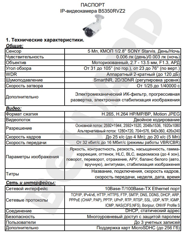 B5350RVZ2 IP-камера видеонаблюдения уличная в стандартном исполнении Beward; 5 Мп; 1/2.8'' КМОП SONY Starvis; 0.006 лк (день)/0.003 лк (ночь); 2xWDR до 120 дБ; H.265/H.264/MJPEG; 2592x1944; 25 к/с; моторизованный варифокальный объектив 2.7-13.5 мм; DC-Drive; электромеханический ИК-фильтр; ИК-подсветка (до 25 м); 12В/PoE; microSDXC (до 128 ГБ); IP66; от -45 до +50°.