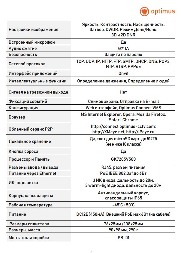 IP-E044.0(2.8)MPCL_V.1 купольная IP-видеокамера Optimus; 1/3” 4Мп Progressive Scan CMOS SC401AI; 2.8мм фиксированный; 3 ИК-диода (до 20м); поддержка кодексов H.265/H.264; поддержка microSD карт до 512Гб; встроенный микрофон; PoE; TCP,UDP,IP,HTTP,FTP,SMTP,DHCP,DNS, POP3,NTP, RTSP,PPPoE; Onvif; RJ45, разъем питания; -45°C +50°C; размеры сплиттера 76х25мм/108х25мм; 290 г.