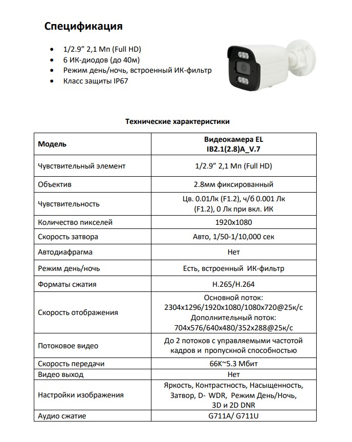 EL IB2.1(2.8)A_V.7 уличная IP-камера Optimus; 1/2.9” 2,1 Мп (Full HD); 6 ИК-диодов (до 40м); 2.8 мм фиксированный; 66K~5.3 Мбит; 1920x1080; H.265/H.264; G711A/ G711U; TCP,UDP,IP,HTTP,FTP,SMTP,DHCP,DNS,ARP,ICMP,NTP,RTP,RCP; Onvif 2.4; детекция движения, детекция человека; RJ45, разъем питания, аудиовход RCA; пластик (основная часть корпуса), металл (передняя часть корпуса), IP67; От -45°С до +50°С; 150х66x67 мм; 170 г.