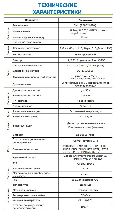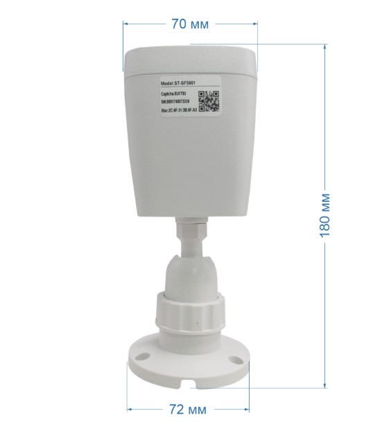 Видеокамера ST-SF5901, Белый, цветная IP,Разрешение: 5Mp (2880*1620), с ИК подсветкой,3 приватные зоны/коррекция углов/зеркалирование,детектор движения/человека, Цилиндрическая, Фокусн. расст.: 2,8 мм (Гор.111°/ Верт. 61°/Диаг. 129°) , Сенсор: 1/2.7” progressive scan CMOS, Дальн. ИК подсветки: до 30 м, Светочувствит. (мин. освещ.): 0,02 Lux (цвет) / 0 Lux (с IR), Кодек сжатия: H.264/H.265/MJPEG (только второй поток), Кодек сжатия аудио: G.711A/U , Аудио вход/выход: Встроенный микрофон/-, Дополнит. возможности: 3 приватные зоны / коррекция углов/зеркалирование, Напряжен. питания: 12 В, PoE: 802.3af (вариант А/В), ИК-фильтр: Механический, Функц. улучш. изобр.: BLC/ HLC/ DWDR/DNR/ AWB/ MWB/Anti-flicker, Smart IR: есть, CV380, IPEYE, Кол-во к/с: 30 к/с, Регулир. кронштейна: 3D-Ось, Раб. темп.: -30...+60, Материал корпуса: Металл, пластик