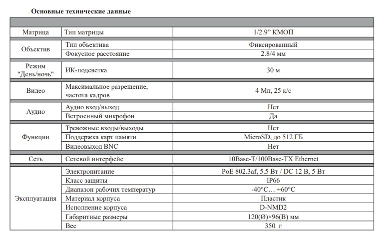 RVi-1NCD4042 (2.8) видеокамера IP купольная RVi; 1/2.9”, 0.02 лк @ F1.6; ИК-подсветка до 30 м; WDR (120 дБ); фиксированный, 2,8 мм; анти-туман; встроенный микрофон; 2 видеопотока; H.264; H.264B; H.264H; H.265; MicroSD до 512 Гб; DC 12 В; PoE (802.3af); IP66; пластик; -40°С...60°С; 96х120 мм; 350 г.