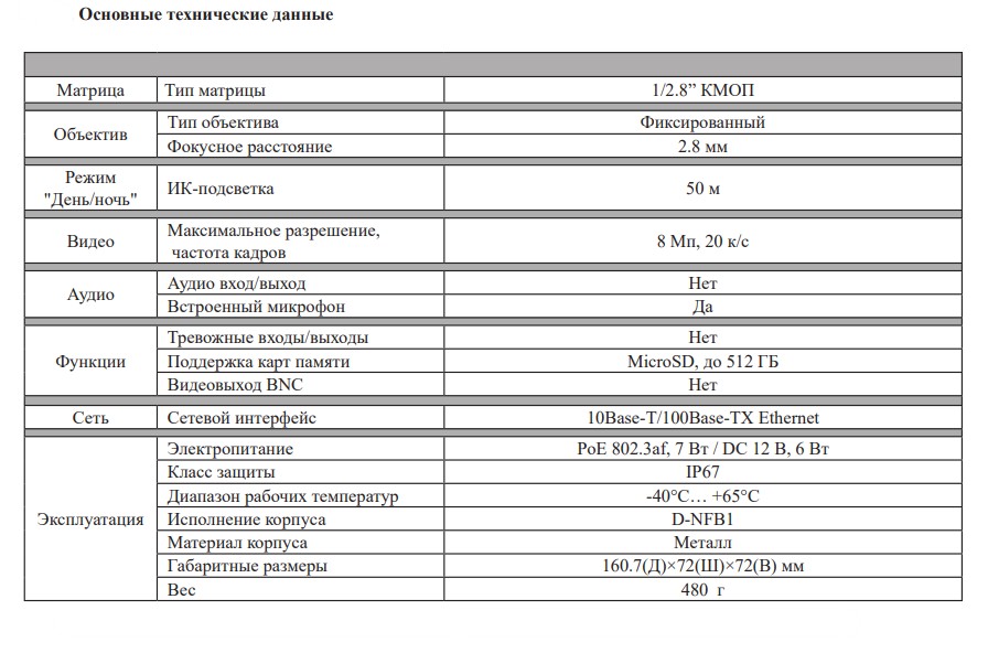 Сенсор: 1/2.8” Sony, 0.01 лк @ F1.6