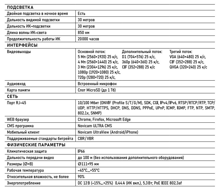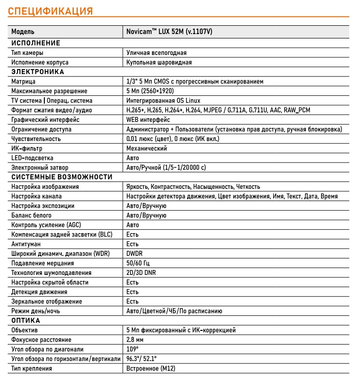 LUX 52M (ver.1107V) уличная всепогодная IP-камера NOVIcam; 1/3" 5 Мп CMOS с прогрессивным сканированием; 5 Мп 25 к/с; поддержка ONVIF и RTSP; объектив 2,8 мм, фиксированный; слот Micro SD (до 1Тб); встроенный микрофон; DC 12В (-15%...+25%) 0.44А (ИК вкл.), 5.3Вт PoE IEEE 802.3af; металл; IP66; -45°С ~ +55°С; ø111×95 мм (ДхВ).